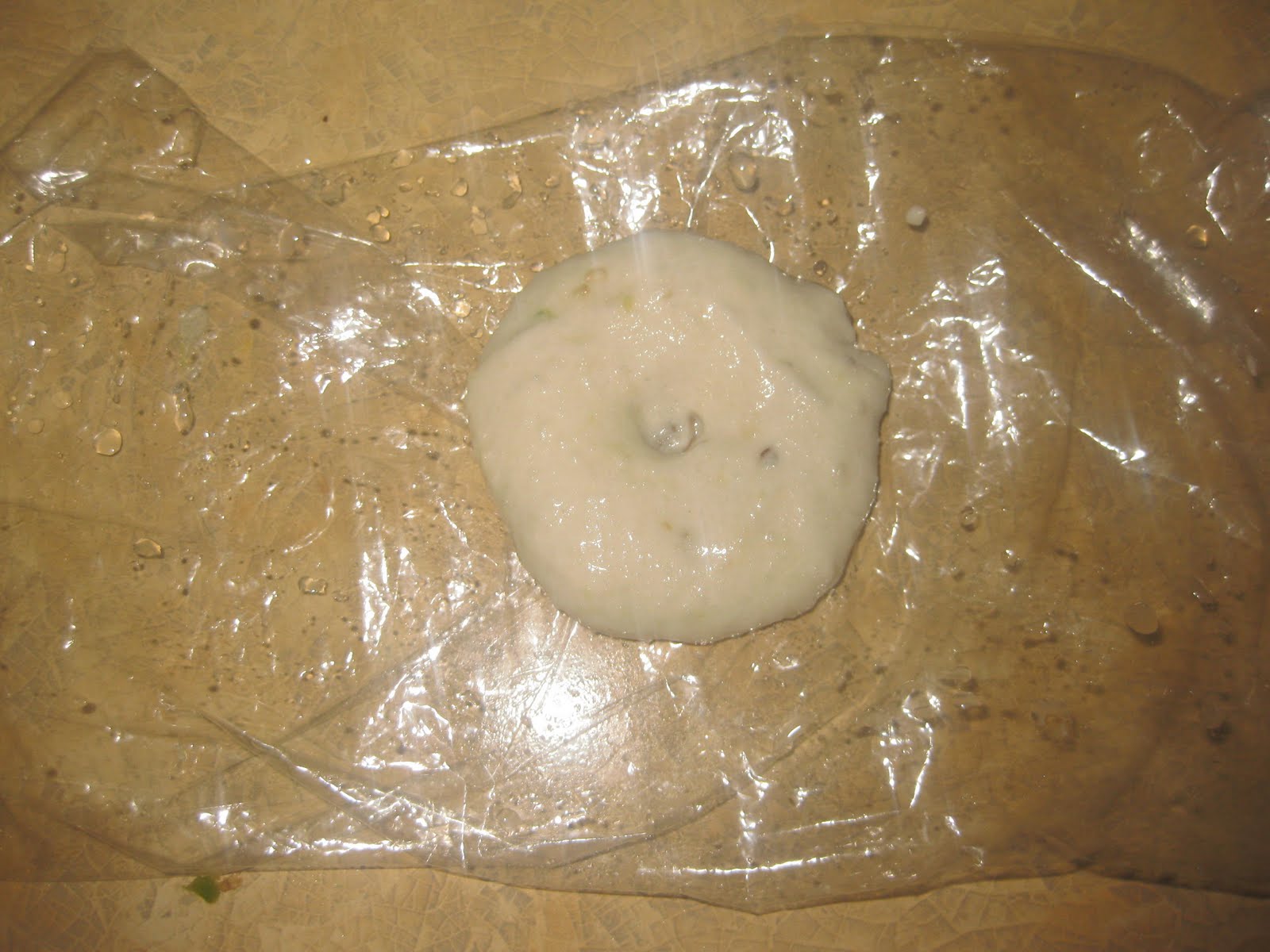 4.Turn the stove into medium flame after the oil is heated. Take a plastic sheet or banana leaf .Apply few drops of oil on the sheet or leaf. Now take a lemon size ball of the batter and slightly flaten it and place a hole in the centre.